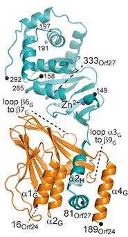 Figure 1. VZV NEC composed of Orf24 and Orf27 with hook-into-groove interaction. |
