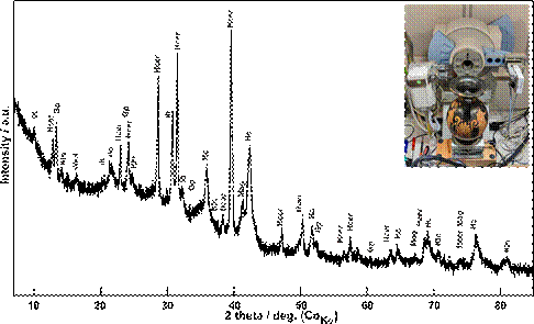 Figure 2. The XRPD pattern collected on black gloss of the vase Peliké 27.3 (4th century BCE, Apulia, South Italy). Identified phases: Gp – gypsum (CaSO4·2H2O, PDF 00-033-0311), Hcer – hydrocerussite (Pb3(CO3)2(OH)2, PDF 04-016-7055), Hc – hercynite (FeIIAl2O4, PDF 00-034-0192), Ilt – Illite (K0.65Al2[Al0.65Si3.35O10](OH)2, PDF 04-016-2975), Kln – kaolinite (Al2Si2O5(OH)8, PDF 1-080-0885), Mag – magnetite (FeIIFeIII2O4, PDF 00-019-0629), Wed – weddellite (Ca(C2O4)·(2.5-x)H2O, PDF 00-017-0541). Photo P. Bezdička.