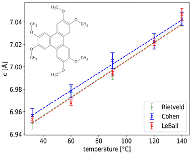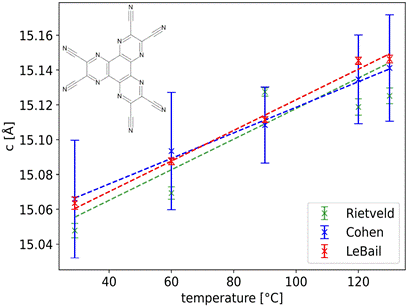 We found that neither the structural model nor the usage of the specific space group provided a good fit for the HMTP powder data which is indicated by indicated by the high mean χ2 values in Tab. 1. Additionally, we observed a large thermal expansion anisotropy in the CLTE for the HMTP powder, along with an indication of negative thermal expansion (NTE). According to recent research, the phenomenon of NTE in organic crystals is not as rare as previously assumed [5]. This behaviour in HMTP crystals likely originates from strong intermolecular hydrogen bonds parallel to the crystallographic a-axis, contrasted by much weaker interactions along the c-axis, perpendicular to the molecular plane. The CLTE of the HMTP film is slightly higher than that of the powder, likely due to interactions with the substrate. For HATCN, the CLTE along the c-direction is nearly identical for both the powder and the film; however, along the a-direction, the film exhibits a value approximately 50% higher than the powder.