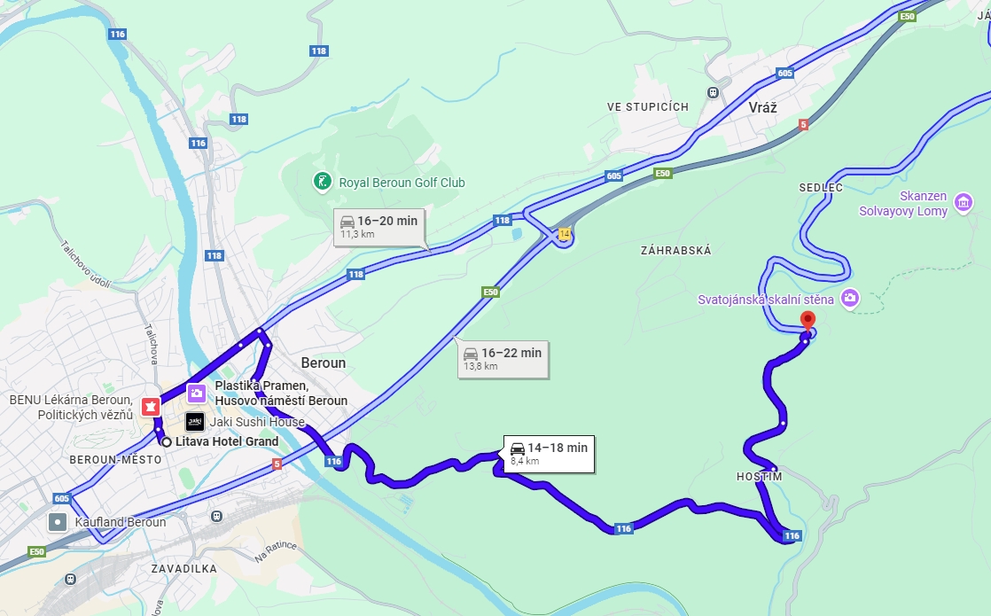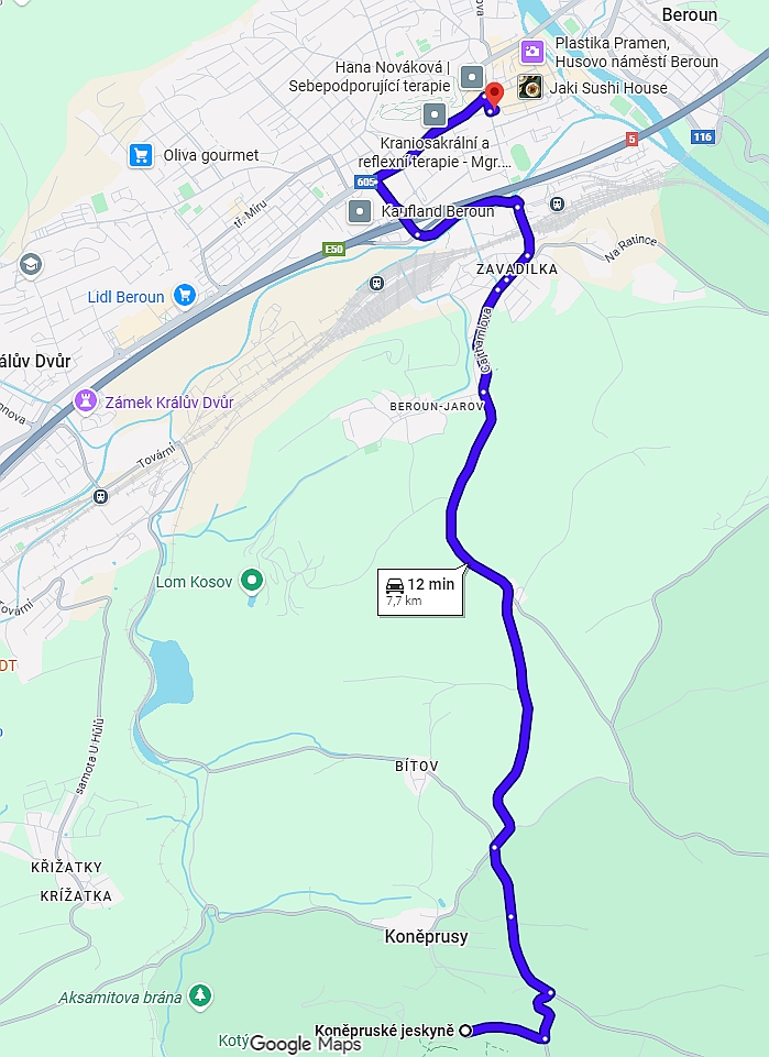 bus 638, cca 40 min., pěšky na autobusové nádraží,cca 12 min a pak k jeskyním