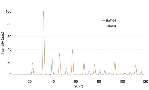 Obrázek. 2. Teoretické difrakční záznamy pro BaTiO3 (P4mm - a=3,943, b=3,958) a LaNiO3 (R-3cH - a=5,578, c=13,677). (Nagenerováno pomocí programu XRDlicious.)